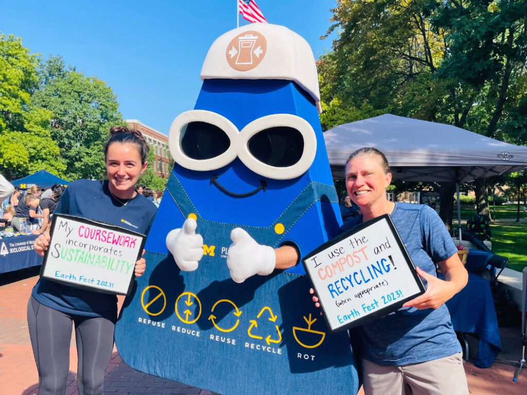 Alex Dryden & Nancy Fulcher (U-M Office of Campus Sustainability) with Rufus, the sustainability mascot. Rufus plays an important role of keeping waste reduction top of mind in a fun, inviting way.
