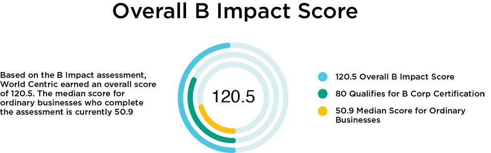B-Corps are recertified every three years. World Centric’s most recent certification from 2023 yielded a score of 120.5. Details can be found on the B Corp website.