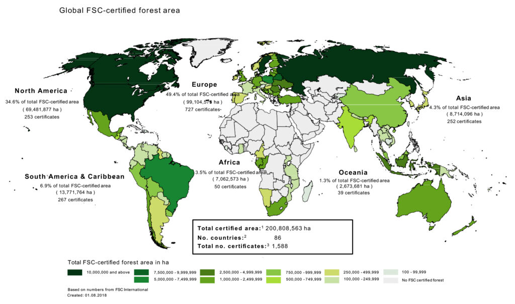 Unfortunately today, only 11% of forests worldwide are currently FSC-certified. And, the majority of these forests are in North America and Europe, as it is more difficult for forests in developing countries to become certified. Here is a map that shows FSC Forests around the world: